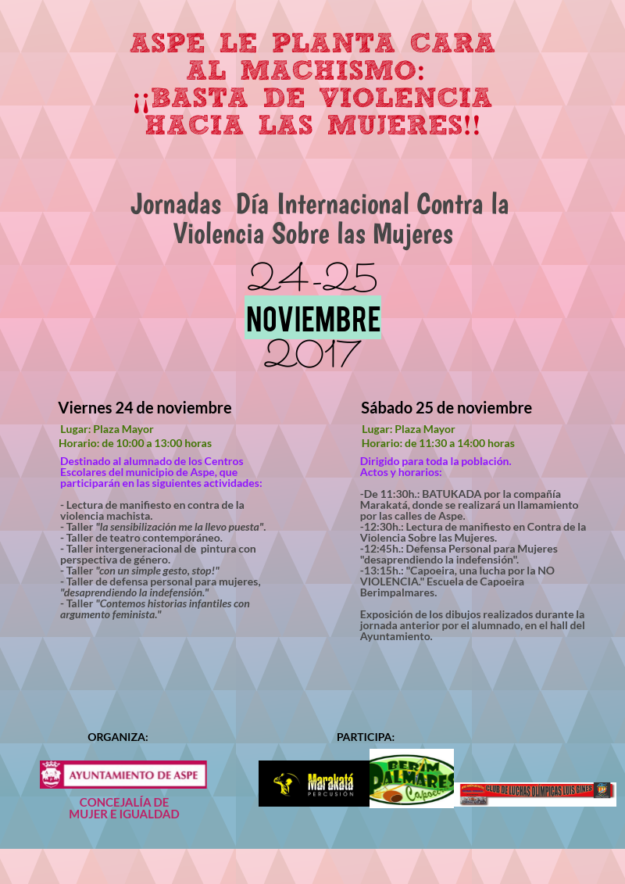 Prevención y sensibilización ¿Somos Iguales? Noemi Moreno, Agente de Igualdad de Ayuntamiento de Aspe. y Trabajadora Social de Salud de Atención Primaria de Aspe. Fechas y horario: 27 de noviembre a las 9:30 h. Centro Social Vistahermosa. C/Ruperto Chapi, 24. 12 de diciembre a las 10:00 h. Biblioteca Centro de Salud. C/Lepanto, 8. Plazas…