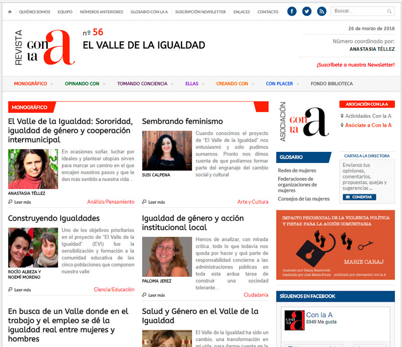 La Revista ConlaA en su n° 56 dedica un monográfico a nuestro proyecto El Valle de la Igualdad. Los artículos escritos por todas las personas que conformamos el Valle y donde se explica toda nuestra trayectoria recorrida desde donde surgió la iniciativa hasta los logros obtenidos en la lucha por la igualdad en cinco municipios, que empezaron sembrado una pequeña semilla y han ido creciendo, dando ejemplo que es posible hacer políticas reales en pro de la igualdad. Todo ello requiere mucho esfuerzo y trabajo para la concienciación y sensibilización en distintas áreas: Formación, Coeducación, Sanidad, Empresas, Medios de Comunicación,…