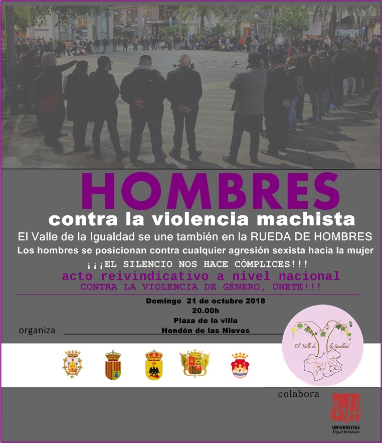 El próximo 21 de octubre El Valle de la Igualdad celebra por tercera vez, la Rueda de Hombres en contra de la violencia machista, en la Plaza de Villa de Hondón de las Nieves a las 20.00 horas.